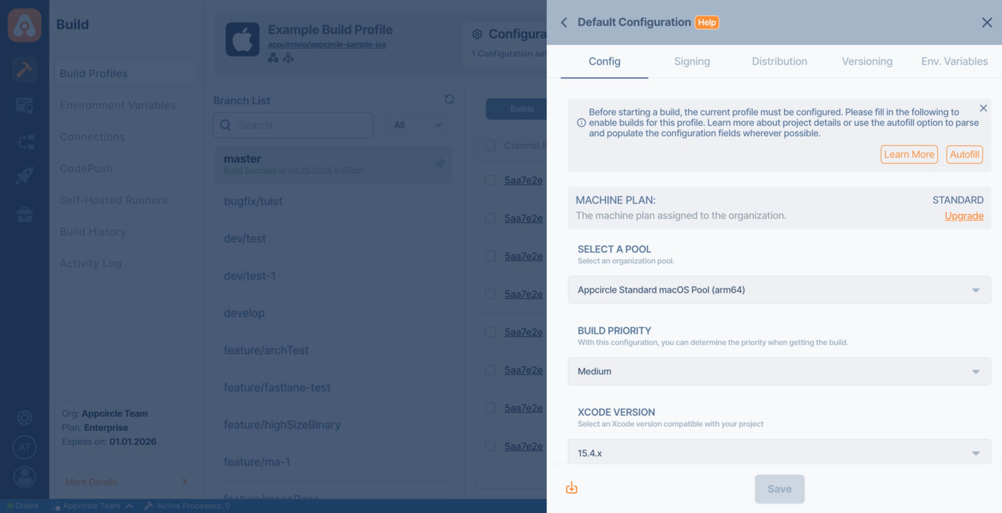 Every build profile needs to know project details regardless of whether the project is an iOS or Android project. Project details can be entered manually or can be fetched from your project automatically by Appcircle if you click on Autofill button.