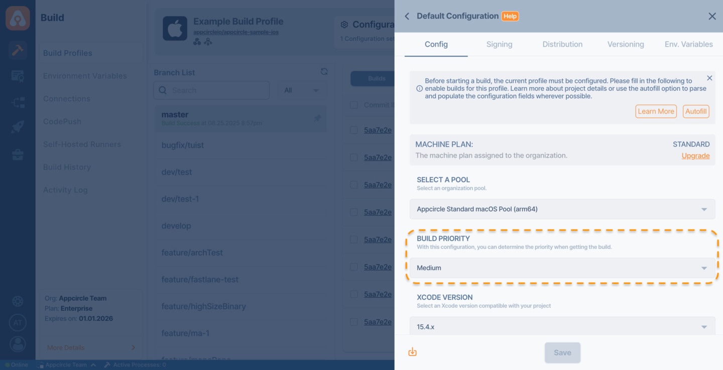 The build priority configuration feature has three levels: Low, Medium, and High.
