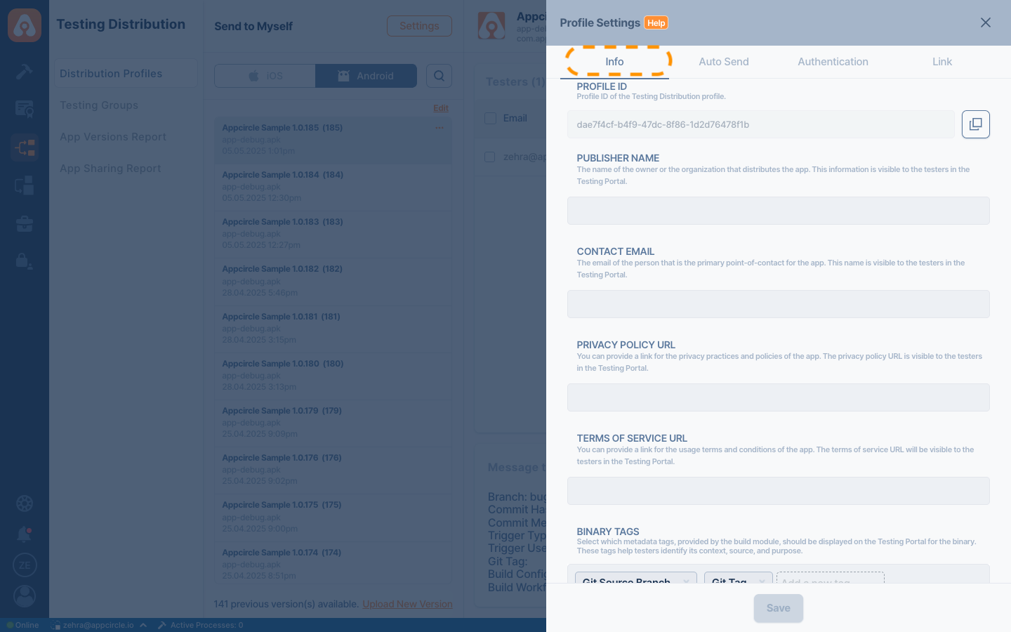 Binary tags can be managed through the Testing Distribution Profile Settings under the Info tab: