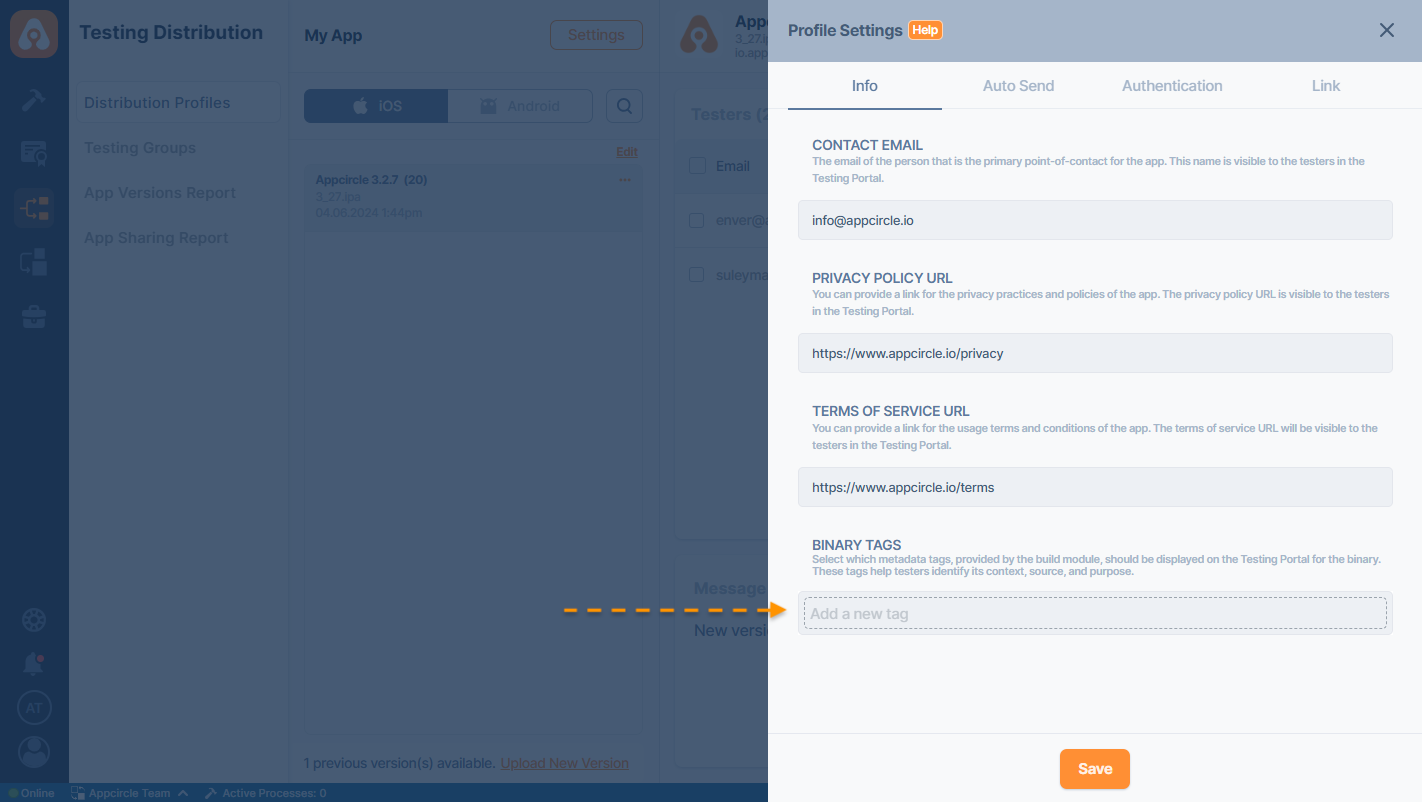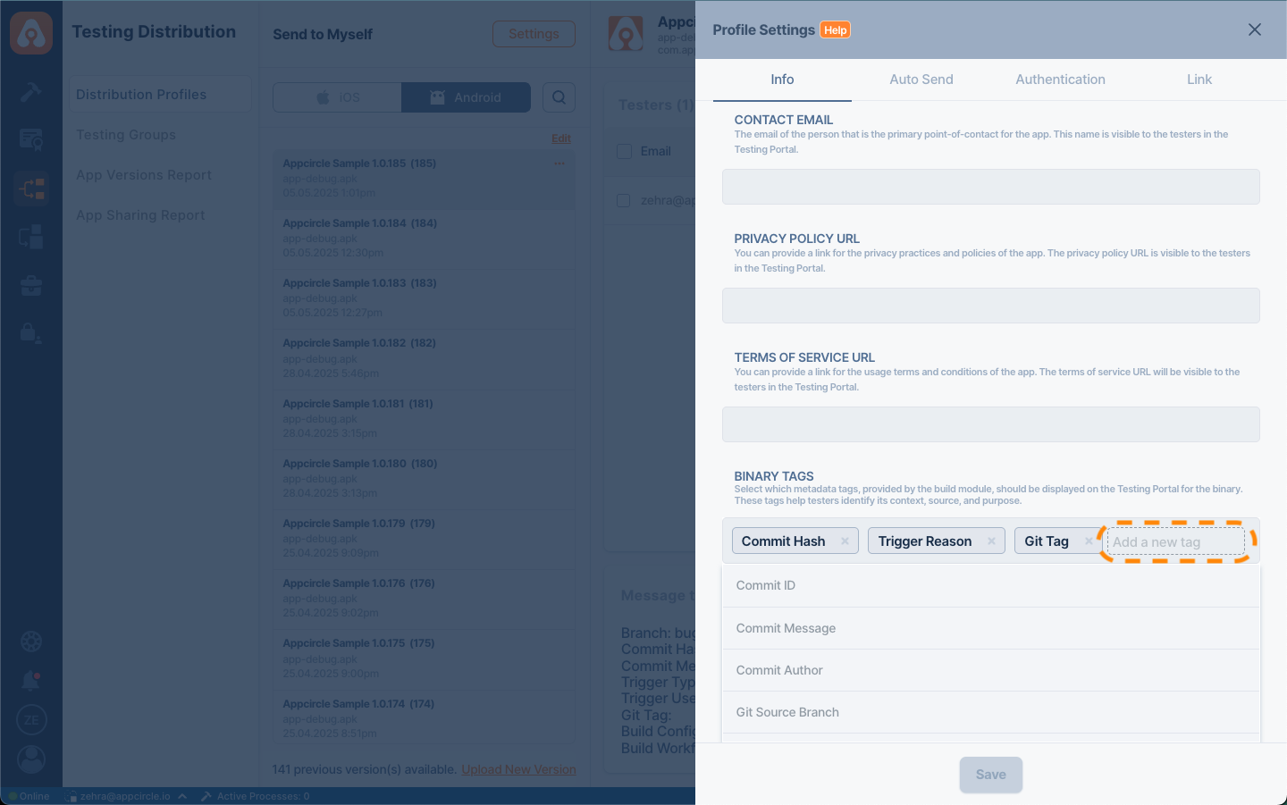 The Binary Tags feature allows you to label your application binaries with meaningful metadata, which is displayed on the Testing Portal for easy identification by testers.