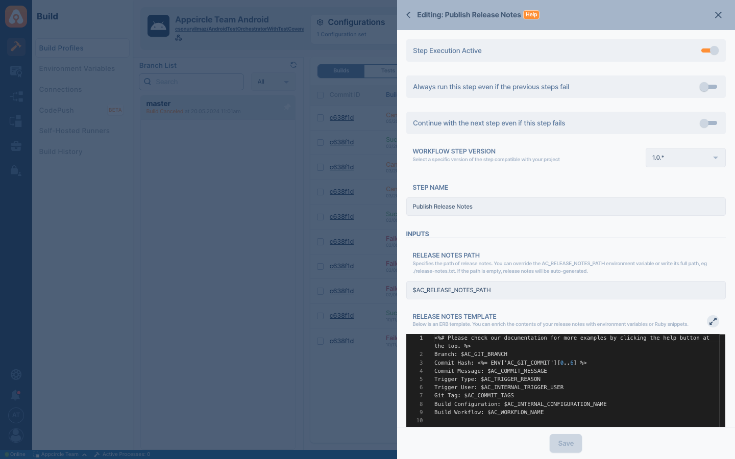 Don't forget to use the Export Build Artifacts step to access the release notes output and distribute it after the build.